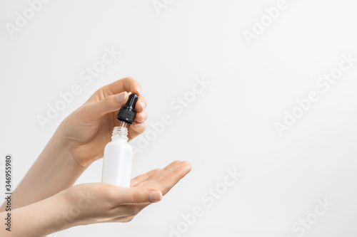 Pipette with collagen moisturizing hyaluron serum in a white light bottle with pipette isolated on grey background. Woman hands holding