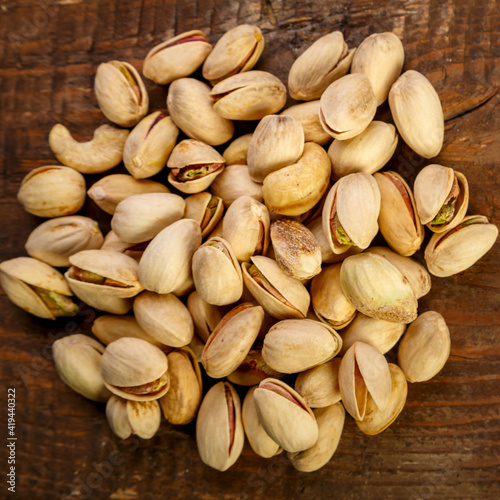 Pistachio nuts in shells scattering on a wooden table.