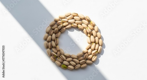 Pistachios Ring Formation Against White Backdrop Featuring Natural Light and Green Accent