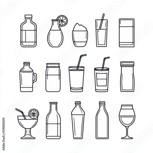 drink, beverage, bottle, goggles, container, line art, outline, icon, symbol, graphic, design element, illustration, food and drink, culinary, cocktail, juice, soda, water, milk, liqueur, alcohol, nonalcoholic, bar, eatery, cafes, menu, cardboard box, label, vector, clip art, retro, vintage, minimalist, simple, clean, modern, black-and-white, monochrome, white background, isolated, set, collection, variety, different, shape, size, style