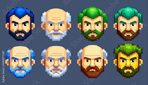 pixel, art, face, man, diverse, expression, angry, old, beard, hair, blue, green, yellow, brown, white, grey, bald, bold, digital, graphic, character, gaming, portrait, vintage, retro, pixelated, icon, vector