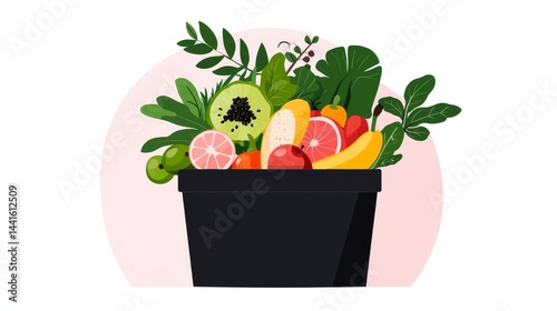 Pixel Art Still Life Colorful Fruits and Lush Greenery in a Black Container