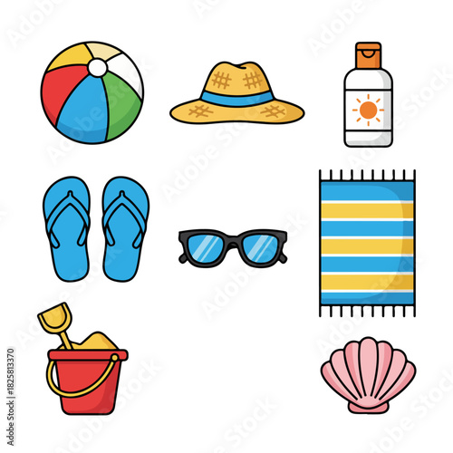 summer, beach, vacation, holiday, travel, leisure, recreation, illustration, icon, beach ball, sunhat, sunblock, flip-flop, sunglasses, beach towel, shovel, seashell, ocean, tropical, sunny, fun, relaxation, outdoors, seasonal, coastal, element, collection