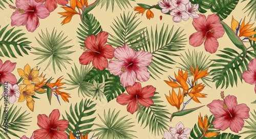 tropical, floral, pattern, hibiscus, palm, leaf, summer, exotic, bright, vibrant, seamless, background, wallpaper, design, textile, fabric, botanical, nature, garden, bloom, blossom, flower, plant, leaf, frond, orange, pink, red, green, yellow, beige, light, colourful, lush, paradise, island, vacation, holiday, decoration, repeating, motif, illustration, art, vintage, retro, aesthetic, trendy, chic, stylish