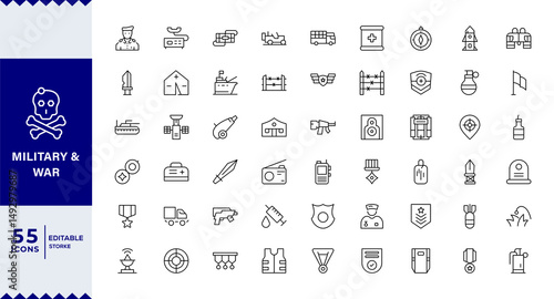Pixel Perfect , Military & War set of web icons in line style,war, military, army line icons. Editable Stroke. Military Equipment, tools, aids and appliances. collection and pack of linear icons.