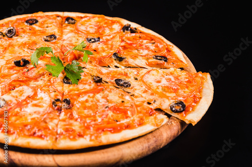 Pizza with olives and tomatoes on a wooden board on a black background