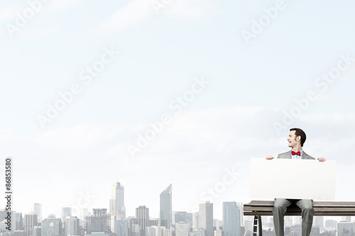 banner, bench, goggles, white, man, advert, advertise, advertisement, blank, board, business, businessman, card, copy, copy space, cut-out, manager, offer, signs, poster, presentation, sale, show, showing, signboard, motto, smile, success, text, men at work