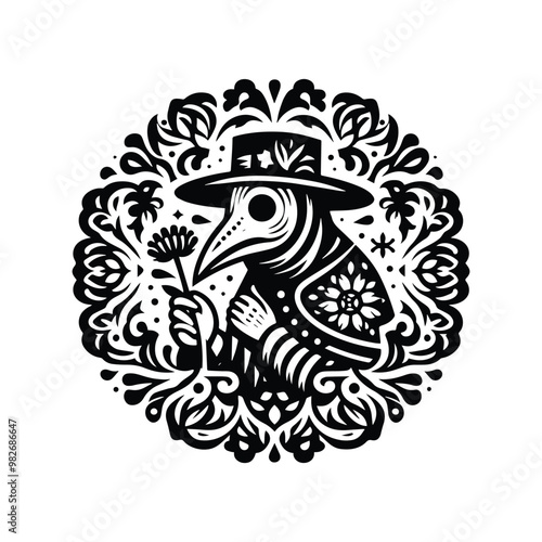 Plague Doctor with folk art decoration in black and white illustrations, cutout graphic