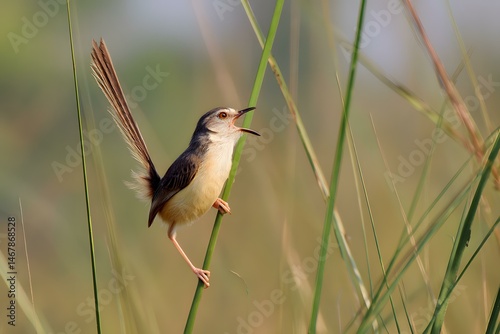 Plain Prinia Calling from Tall Grass with Cocked Tail in Warm Light