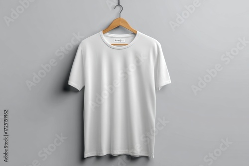 Plain White T-Shirt Hanging on a Wooden Hanger Against Gray Background