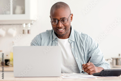 man, bald, african american, interior, smiling, black, adult, computer, cyberspace, home, laptop, modern, technology, office, work, concept, business, person, mature, budget, online, plan, free space, happy, lifestyle, goggles, finance, economy, payment, accounting, loan, positive, document, calculating machine, financial, kitchen, telecommuting, people, bill, tax, credit, analysis, working, debt, account, cost, focused