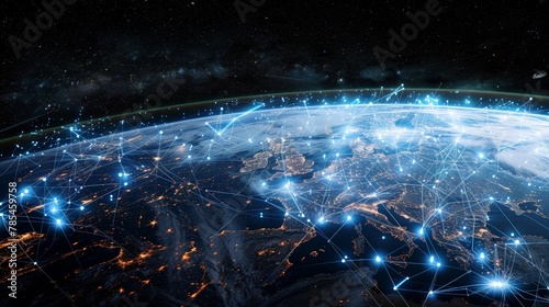 planet with a network of lines connecting it to other planets. Connections system and global datas exchanges over the globe 3D rendering elements of this image