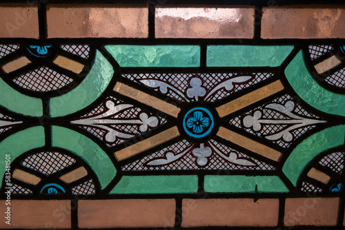 Plano detalle de una de las vidrieras de colores de la Catedral de Burgos por donde entra la luz del sol al interior.