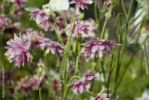plant of Aquilegia Vulgaris, pink and white flowers, in full bloom of spring, yellow pistil, variety Nora Barlow, family of Ranunculaceae, gardening, sun light, background, Italy