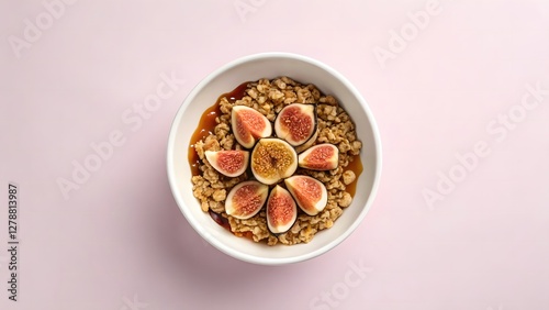 plant-based breakfast + granola + homemade A bowl of granola topped with fresh figs, beautifully arranged on a pink background.