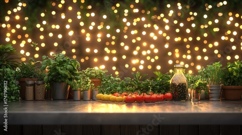 plant, tomatoes, light, garden, table, herb, basil, parsley, rosemary, oregano, thyme, pot, jar, bottle, glasses, rustic, bokeh, background, warm, inviting, cosy, summer, fresh, healthy, food, natural, organic, still life, arrangement, decoration, evening, night, counter, kitchen, cooking, ingredient, produce, harvest, growth, greenery, foliage, leaf, bright, yellow, red, green, wood, container
