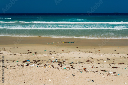Plastic and other rubbish thrown on the sandy seashore, trash on the sea beach. ecological problem. Dirty sandy beach