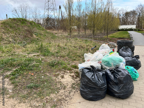 Plastic bags with garbage, collected in a pile. Garbage removal. The result of garbage collection by a volunteer organization.