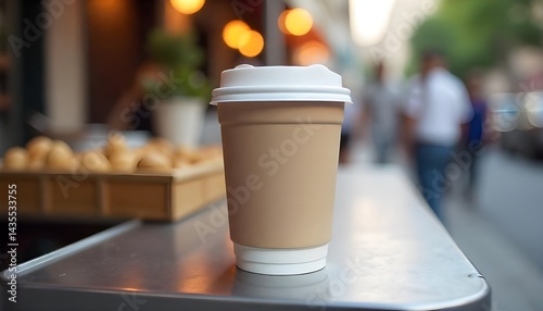 Plastic drink cup with no label, placed on aluminum cart counter with street style background
