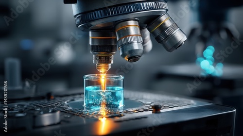 Plastic Hydro Clean Microscope Analyzing Blue Liquid Sample in Modern Laboratory