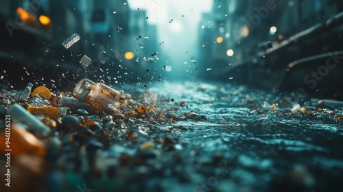 Plastic Pollution in River Close Up