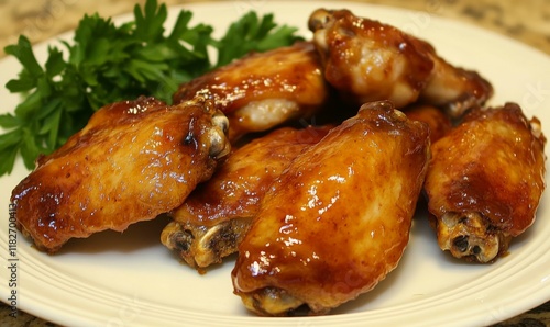 Plate of chicken wings with a side of parsley. The wings are cooked and glazed with a brown sauce