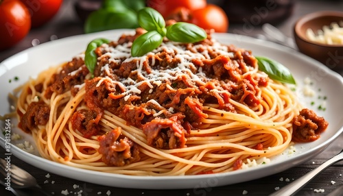Plate of delicious spaghetti Bolognaise or Bolognese with savory minced beef and tomato sauce garnished with parmesan cheese