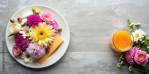 Plate of flowers with Jack Reed and glass of juice, plate, flowers, Jack Reed, glass, juice, stylish, decor