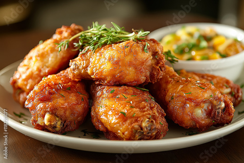 Plate of fried chicken with a side of vegetables. The chicken is golden brown and the vegetables are fresh and colorful. The plate is set on a table and the overall mood of the image is inviting
