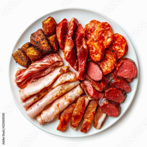 meat, sausage, pork meat, beef, bacon, slice, food, assortment, assorted, set, veal, sirloin, plate, snack, top, view, up, high, isolated, white, background, red
