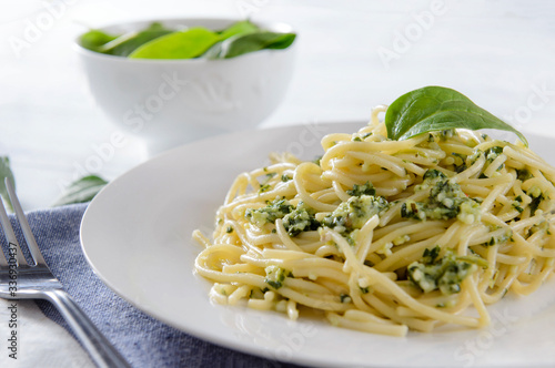 plate of pasta, spaghetti with spinach, fork on a white background close-up