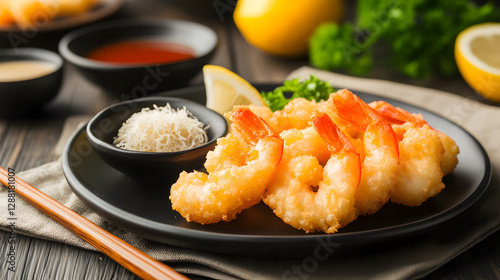 Plate of tempura shrimp and vegetables with tentsuyu dipping sauce, Generative AI