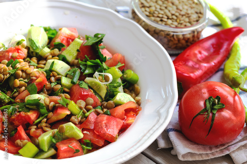 salad, food, tomatoes, vegetable, healthy, green, fresh, vegetable, red, pepper, meal, lettuce, diet, plate, dinner, tomatoes, vegetarian, white, lunch, dish, cucumber, onion, cookery, isolated, lentil, wooden, background, bowl, delicious, table, top, view, closeup, epicure