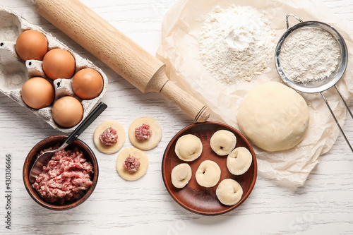 background, colours, composition, cook, cookery, culinary, delicious, dinner, dish, dough, dumpling, dumpling, eat, eating, egg, filling, flat, flour, food, homemade, ingredient, lay, light, making, meal, meat, mince, minced, nobody, nourishment, object, plate, prepare, prepared, raw, receipe, russian, sieve, spoon, steamed, stuffed, taste, tasty, top, traditional, uncooked, view, wooden