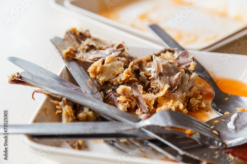 Plate with remnants of fried chicken in the restaurant