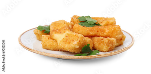 Plate with tasty fried mozzarella sticks and parsley isolated on white