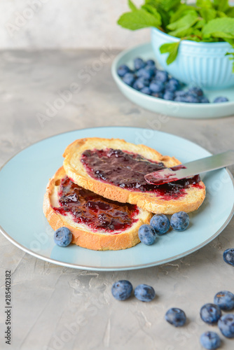 Plate with tasty toasted bread and blueberry jam on grey table
