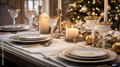 plate, silver, gold, christmas, present, illustration, tableware, cutlery, napkin, ring, elegant, setting, holiday, dinner, party, glamour, celebration, festive, decor, luxury, sparkle, shine, metallic, gift, wrapping, ornament, centrepiece, style, sophistication, opulence, charme