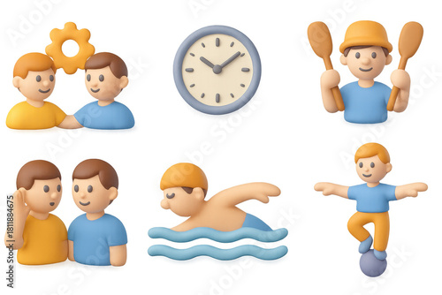 three-dimensional, playful, cartoon, character, swimming, sport, teamwork, clock, activity, colourful, children, fun, diverse, interaction, friendship, kayak, dance, synchronized, smiling, joyful, cute, dynamic, vibrant, children, recreation, hobby, lifestyle, creative, expressive, social, cheerful, animated, play, casual attire, leisure, bonding