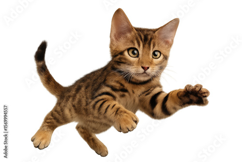 kitten, cat, playful, pet, animal, felino, cute, adorable, domestic, mammal, predator, hunter, striped, pattern, fur, curious, young, happy, cheerful, isolated, cut-out, studio shot, clipping path, active, dynamic, posing, full body, expressive, whisker, brown, tan, funny, humorous, charming, lively, energetic