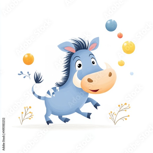 Playful Blue Warthog Cartoon Illustration with Pastel Bouncing Balls
