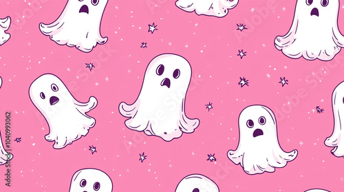 Playful cartoon ghosts on a pink background create a whimsical Halloween pattern for festive decor
