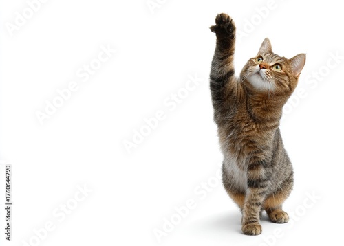 Playful cat reaching up on hind legs with a paw, curious and engaging, perfect for pet-related campaigns, adding a touch of whimsy and charm to your project