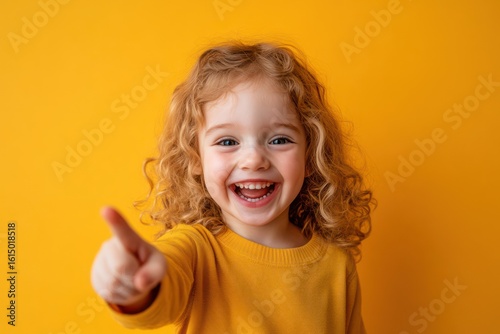 Playful Child Laughing and Pointing with Big Smile in Bright Studio