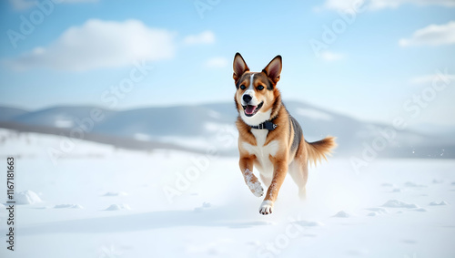 Playful Dog Running in Snowy Landscape on a Sunny Day