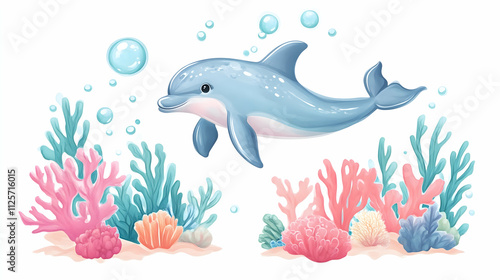 dolphin, coral reef, underwater, marine life, ocean, sea, illustration, hand-drawn, cute, cartoon, whimsical, playful, happy, colourful, vibrant, nature, aquatic, animal, ocean life, tropical, children, children, childcare center, baby, ocean life, beach, summer, water, art, design, decor