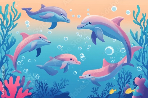 dolphin, ocean, water, swimming, playful, marin, mammal, coral, reef, bubble, underwater, aquatic, life, sea, animal, wildlife, nature, happy, joyful, cute, adorable, pink, blue, turquoise, vibrant, colourful, scene, illustration, art, graphic, design, background, summer, fun, family, group, together