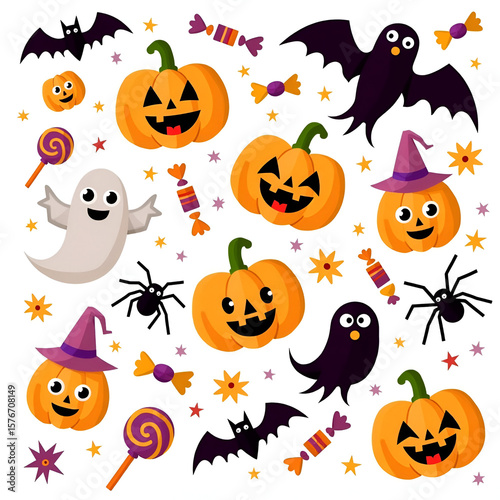 Playful Halloween Clipart Collection with Pumpkins, Ghosts, Bats, Spiders, and Candy - Colorful and Cute Design Elements