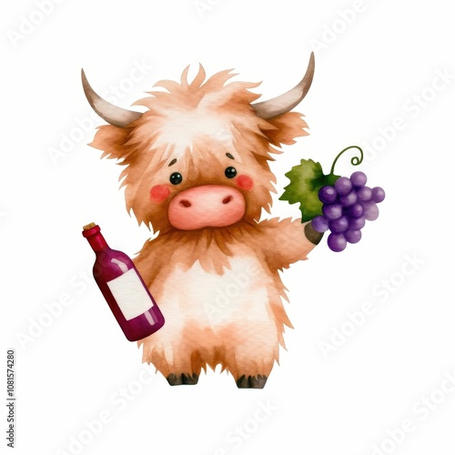playful, highland, cow, holding, wine, bottle, grape, farmyard, setting, watercolor, illustration, cheerful, atmosphere, whimsical, animal, cute, character, nature, cartoon, beverage, portrait, drink, fun, creative, colourful, happy, adorable, farm animal, artistic, humor, epicure, vibrant, seasonal, relaxing, scenery, lifestyle, festive, quality, storytelling, family