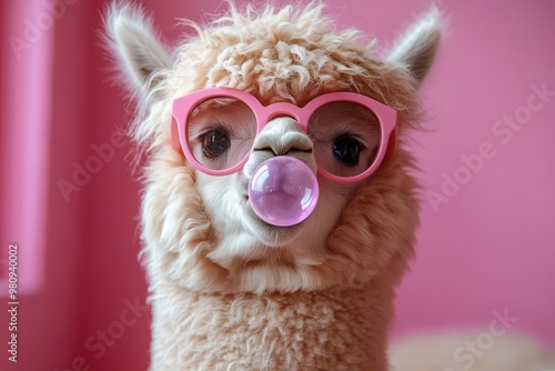 alpaca, bubblegum, sunglasses, pink, trendy, playful, quirky, fun, fashion, cute, whimsical, pop art, stylish, humorous, vibrant, character